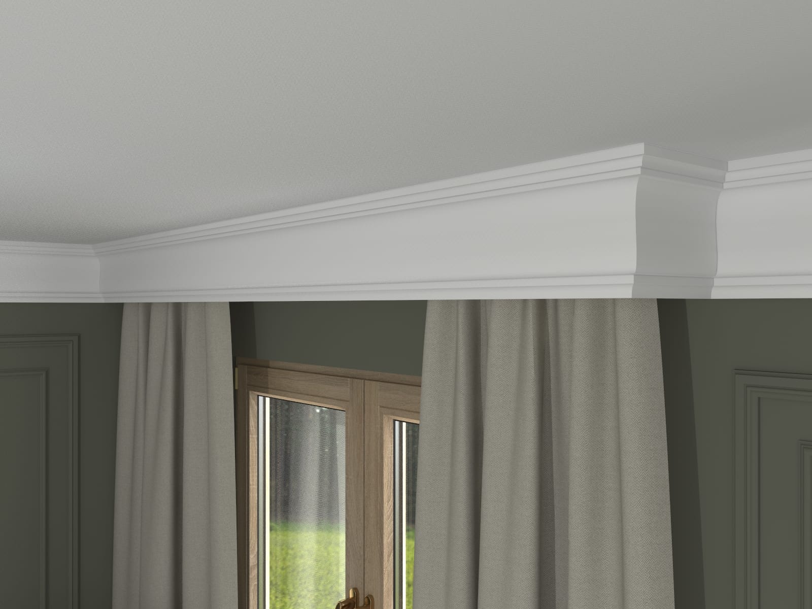 Model najczęściej stosowany w klasycznych wnętrzach, jako dekoracyjna maskownica szyny karniszowej. Charakteryzuje się precyzją wykonania, wyraźnymi wzorami i zdobieniami. Podkreśli charakter wnętrza, będzie uzupełnieniem estetycznego wyposażenia. Sprawdzi się jako eleganckie uzupełnienie wystroju okna. Zastosowana z razem z Listwą przysufitową LKS-310 tworzy ramę elegancko zwieńczającą ściany na styku sufitu.